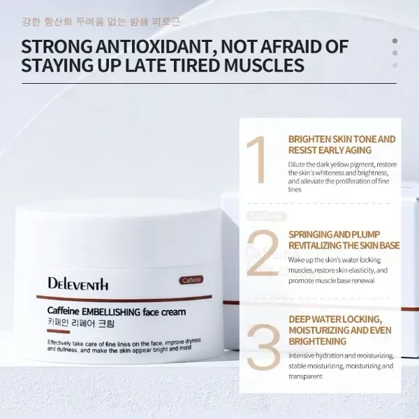 La Crema Facial Hidratante Con Cafeína de deleventh es la solución ideal para quienes buscan un cuidado facial efectivo y rejuvenecedor. Formulada especialmente para adultos, esta crema combina propiedades hidratantes y antioxidantes que ayudan a combatir los signos del envejecimiento, como las arrugas y la pérdida de firmeza en la piel.